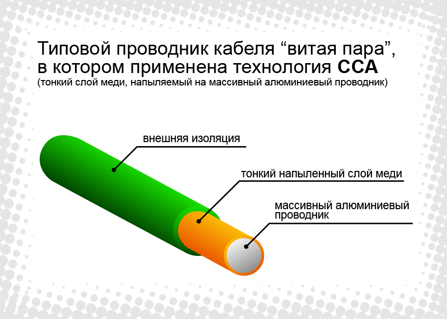 Да, в подавляющем большинстве кабелей «витая пара», импортируемых в РФ из ЮВА, применяются алюминиевые проводники с напыленным слоем меди. Такая структура проводника описывается аббревиатурой CCA (Copper Clad Aluminium). Эта «экономия» превращает данную кабельную продукцию в сомнительную и недолговечную поделку, которая зачастую не соответствует никаким стандартам и способна передать сигнал лишь на очень короткие расстояния (десятки метров), и при этом на пониженных скоростях.